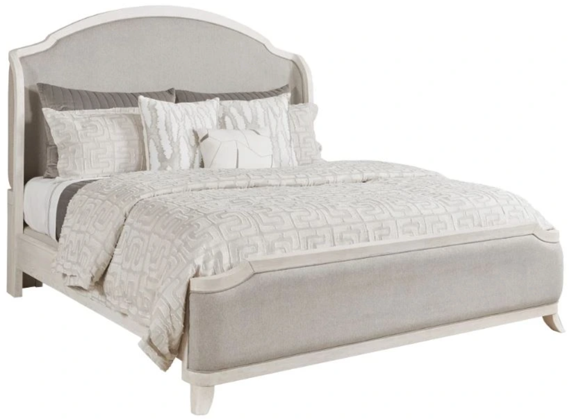 Drape your bedroom with sophisticated style with our Carlyn Upholstered bed. This bed is designed with a shelter style contour that adds interest and dimension to the room. The headboard's shape makes it a natural centerpiece, with an arch that floats down and curves around, framing the soft upholstery.Read More