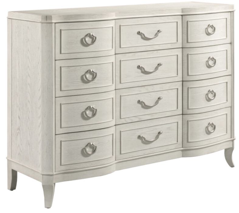 Beautifully crafted with a serpentine shape and elegant tapered saber legs and raised bead, this dresser will add sophistication to your bedroom. It is constructed of cathedral white oak veneers in an Eggshell finish, and comes equipped with a removable jewelry tray in the top center drawer, cedar lined bottom drawers, adjustable levelers, and a center foot for stability.Read More