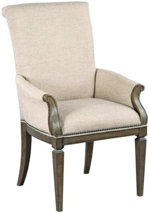 Gorgeous upholstered arm chair with nail head trim and reeded posts and tapered legs makes this a perfect chair for any dining room setting formal or casual.
