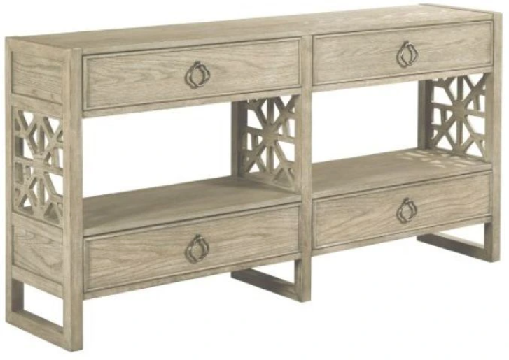 Vista is a casual transitional collection, utilizing everyday transitional styling and incorporating it with some seemingly casual elements and accent pieces. Hall console with geometric grids in the ends, four drawers for storage and two shelves for display make it a beautiful piece for any room.Read More