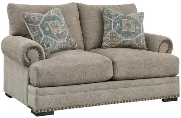 Looking to enhance your home's visual appeal? This loveseat offers sophisticated design, comfort and elegance with tonal colors, roll arms and nailhead accents. Enjoy optimal coziness as you nestle into luxurious soft upholstery and feather-blend cushions. Perfect for modern spaces, it's just the spot to sit back and relax in style.Read More