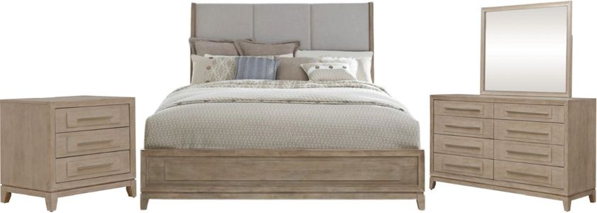 Featuring a spacious california king upholstered headboard with elegant square-panel detailing in a soft taupe hue, this set includes a dresser with mirror and a chest—each drawer equipped with premium felt-lined tops, cedar-lined bottoms, soft-close glides, and sleek brushed-nickel bar pulls.Read More