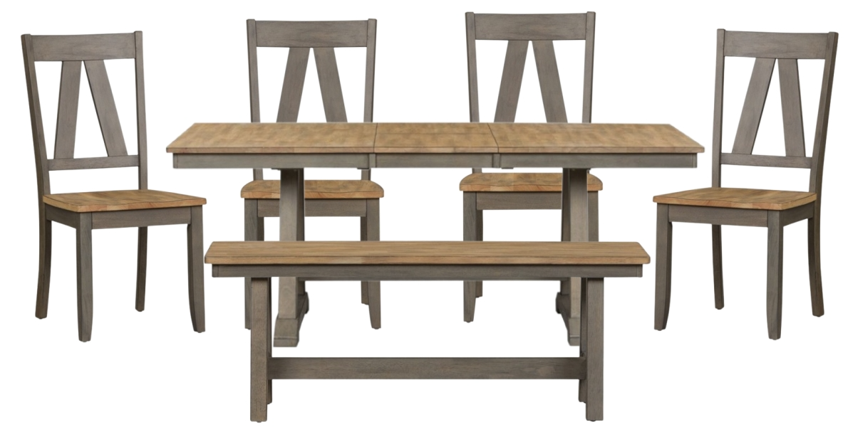 Wow family and friends with the Lindsey Farm six-piece trestle table set. Crafted of rubberwood solids and veneers, this set features a gray and sandstone finish and consists of the trestle table, four splat back side chairs, and a bench.Read More
