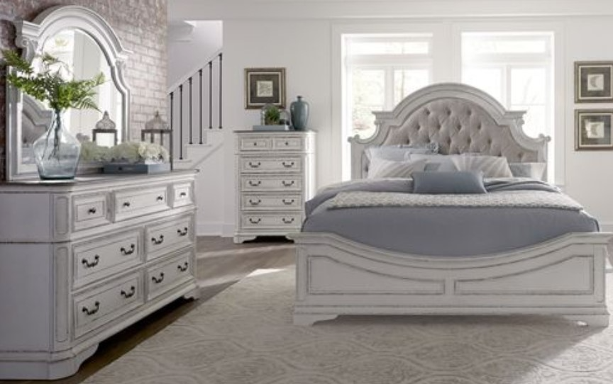 Opt for an elegant display. A refined yet relaxed feel describes the Magnolia Manor king upholstered bed, dresser, mirror, and chest. Crafted of poplar solids with white oak and birch veneers, this kit features an antique white finish with heavy artistic chipping and weathered brown with whitewash tops.Read More