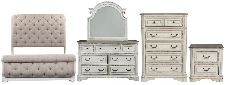 A refined yet relaxed feel describes the Magnolia Manor queen upholstered sleigh bed, dresser, mirror, chest, and nightstand. Crafted of poplar solids with white oak and birch veneers, this kit features an antique white finish with heavy artistic chipping and weathered brown with whitewash tops.Read More