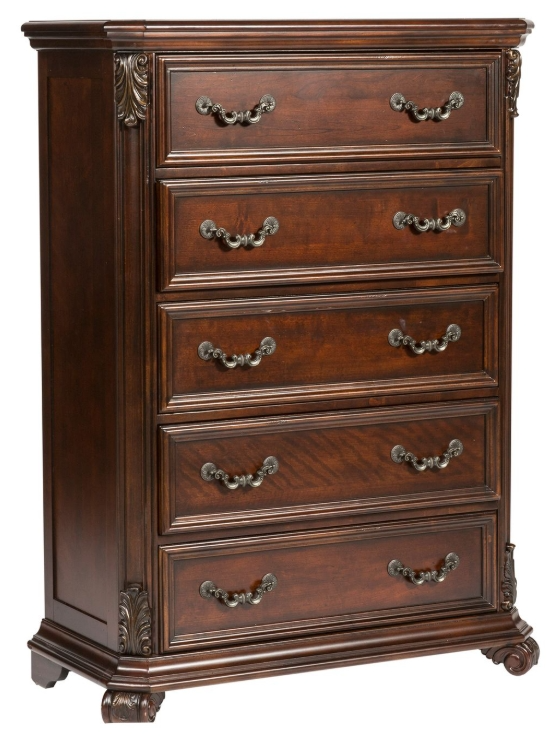 Enhance any room with this luxurious Messina Estates chest while obtaining an elegant European style. Crafted with rubber wood solids and birch veneers, this piece features 5 drawers, fully stained interior drawers, felt lined top drawers and beautifully detailed acanthus leaf overlays.Read More