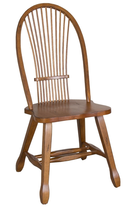 Sit in style with the Treasures sheaf back side chair. Crafted of rubberwood solids, this piece features a rustic oak finish, nylon chair glides to protect your flooring, saddle shaped seating for added comfort, and a H-shaped stretcher for added support.Read More