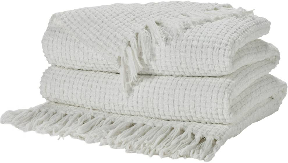 Waffle-style weave and tasseled fringe adds warmth and visual appeal