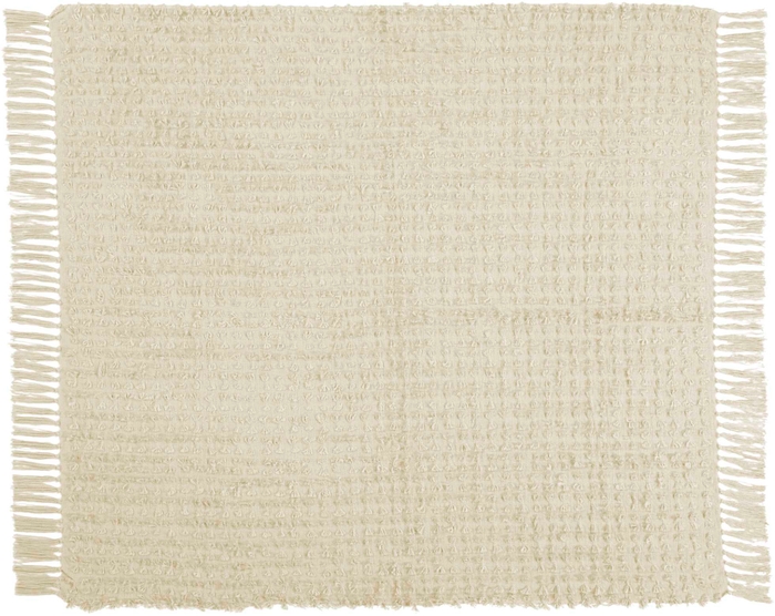 Simple yet elegant, this textured throw blanket adds warmth with a touch of style to your couch, chair, or bed. The woven design features a pattern of clustered threads on its surface, which is finished at both ends with knotted fringe. Presented in neutral cream, in a standard 50" x 60" size.Read More