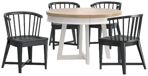 This table and four chair dining set combines style and functionality. Bold contrasting black spindled barrel chairs pair beautifully with the round 48" table with its natural weathered finished top, creating a unique look to freshen your dining space.Read More