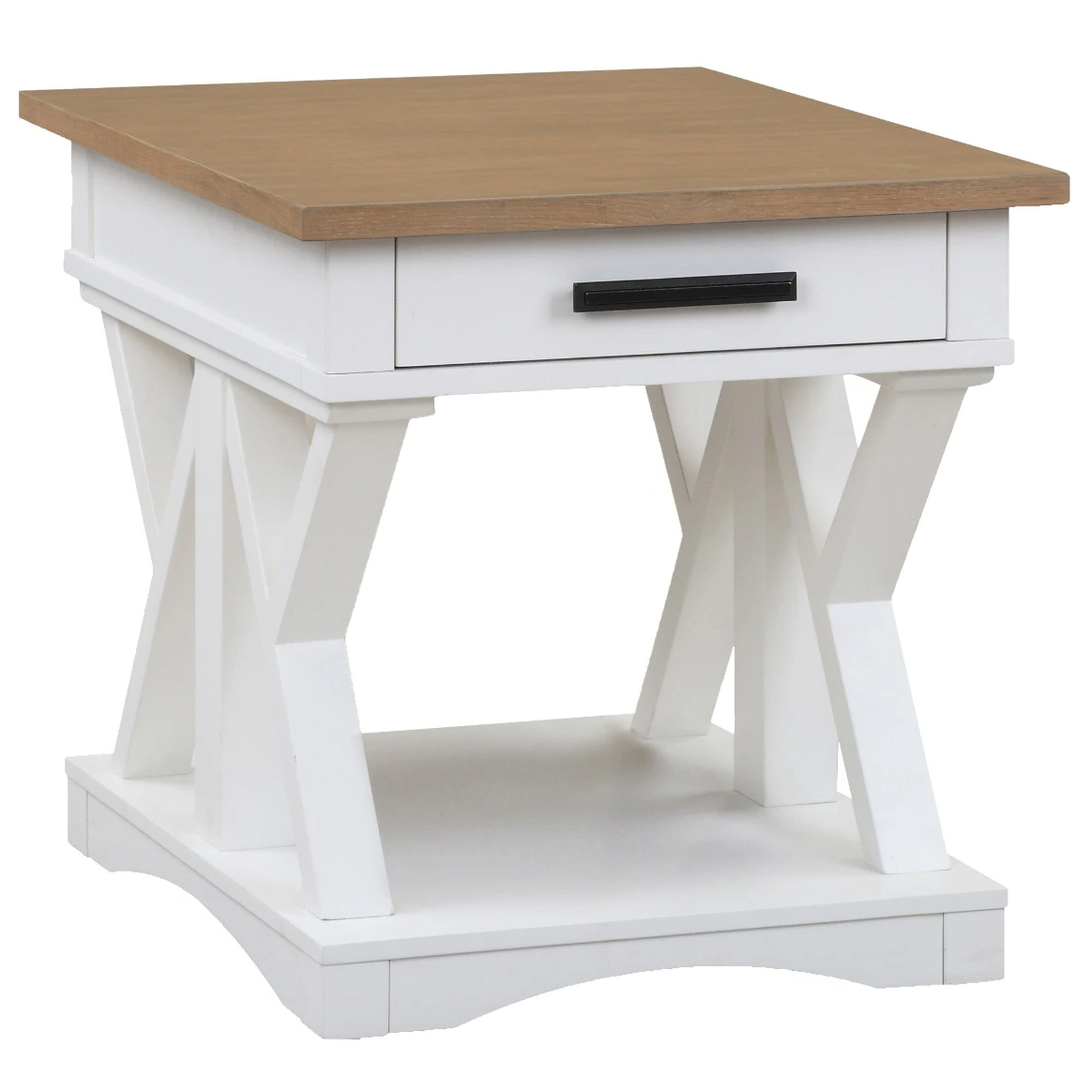 The Americana Modern End Table is where fun meets function. Its classic design character is highlighted in a soft Cotton white finish and features a contrasting wood-grain top in Weathered Natural. The open area below is perfect for storage while its center drawer and crossbeam silhouette create a stunning visual.Read More