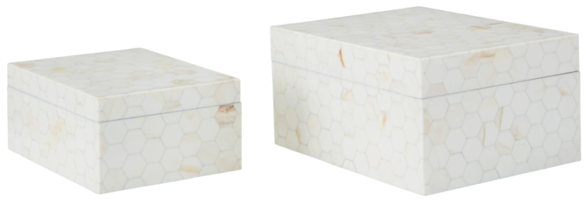 Looking for a casually cool home accent? This set of boxes stacks up beautifully. A hexagonal mosaic design and cream finish bring a laid-back element to your decor. What a stylishly effortless way to refresh your shelves and tabletops.Read More