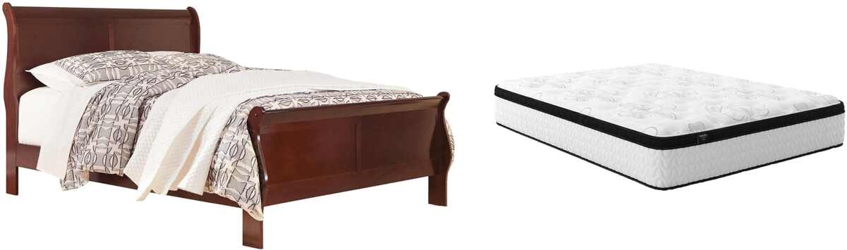Includes sleigh bed (headboard, footboard, rails) and hybrid innerspring mattress