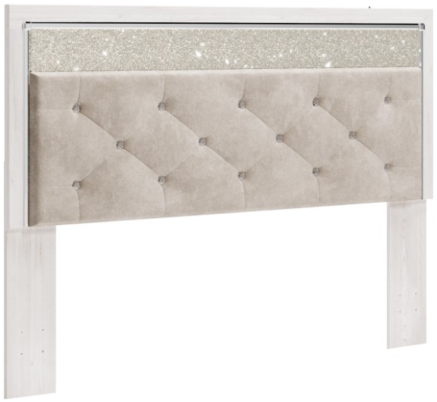 The epitome of fashion-forward design, this king/California king upholstered panel headboard is a beautiful blend of comfort and luxury. Shiny chrome-tone accents, a pearlized finish, and button-tufted upholstery bring a glam touch to the richly rustic appearance. Remote-controlled LED lighting adds style and modern conveniences to your restful retreat.Read More