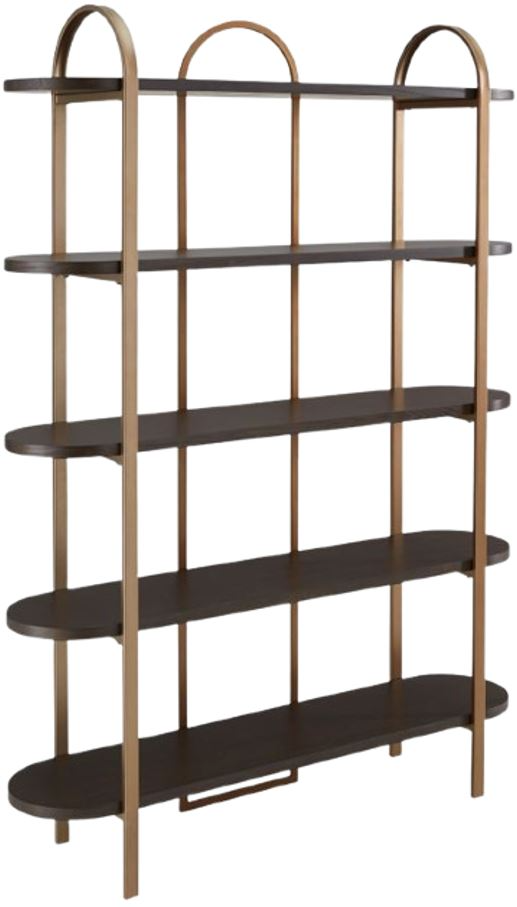 With its mixed-material look, this bookcase seamlessly fits into a wide range of modern settings. Five fixed display shelves in a brown finish are balanced by sleek antiqued gold-tone metal supports. Offering storage and superior style for books or showcasing decor, this bookcase is a masterful way to stay organized.Read More