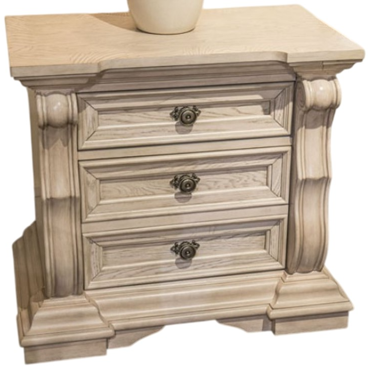 This elegant nightstand features three drawers, including a concealed drawer for keeping valuables secure. A built-in 110V power supply with dual USB ports adds modern convenience. Finished in antique white with classic accents, it's the perfect blend of traditional charm and everyday functionality.Read More