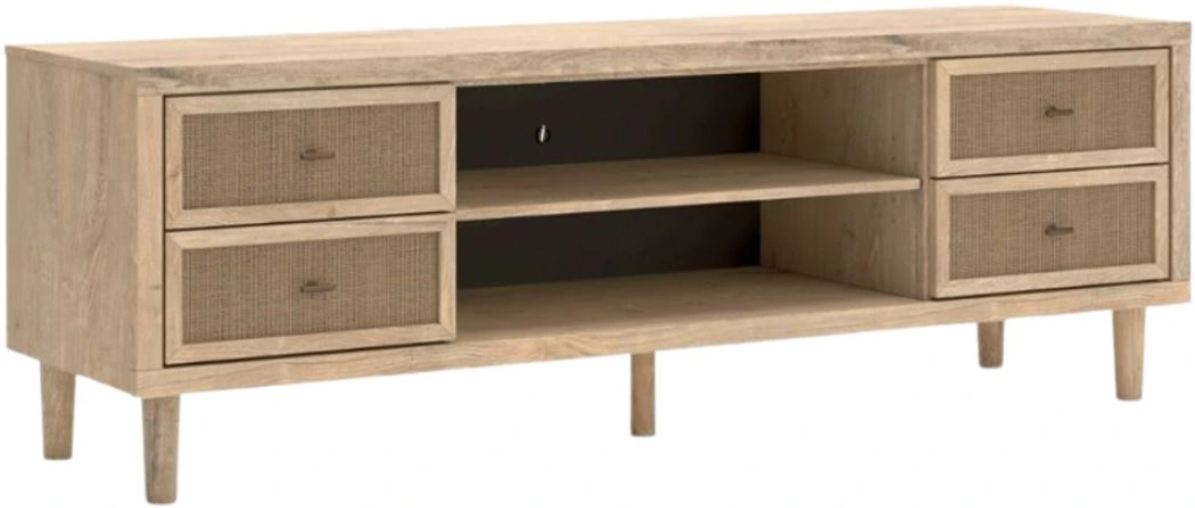 Clean-lined and contemporary—but far from stark—this TV stand is a fresh style awakening. Pairing a light finish with replicated oak grain and textured beige cane details, its mixed materials bring a naturally versatile vibe to your favorite spot for binge-watching or gaming. Sleek, simple hardware plays perfectly with the modern aesthetic.Read More