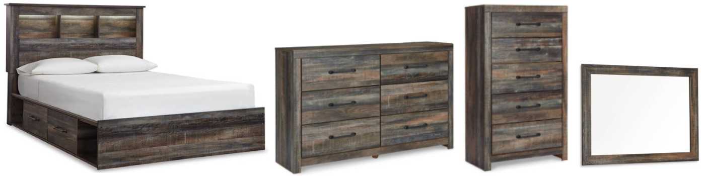 Includes bed (bookcase headboard, footboard, 2 underbed storage units, platform rails and wood roll slats), 6-drawer dresser with mirror and 5-drawer chest