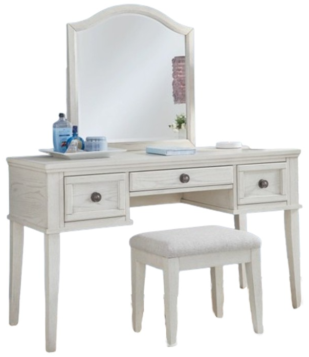 Elegant, timeless furnishings take your bedroom to the next level. Nothing does that better than this mirrored vanity with bench. The antiqued white finish with a wonderful grain texture radiates sophistication, while dark bronze-tone knobs add an ornate touch. Three storage drawers and a soft cushioned seat round out this tasteful set.Read More