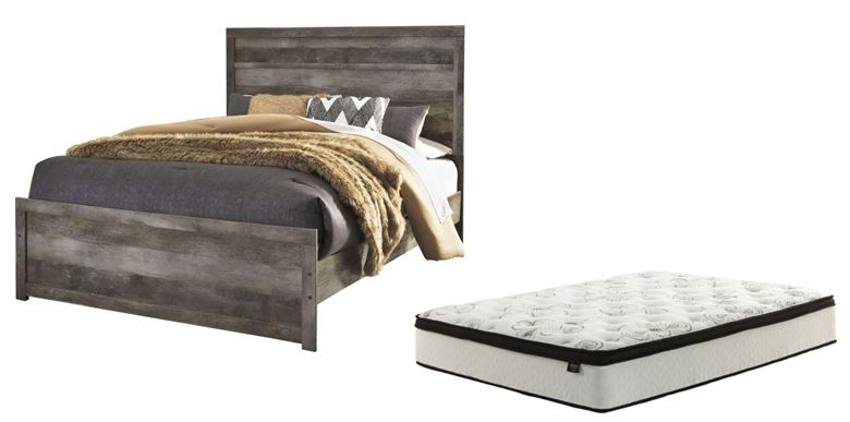 Includes queen panel bed (headboard, footboard, rails) and hybrid innerspring mattress