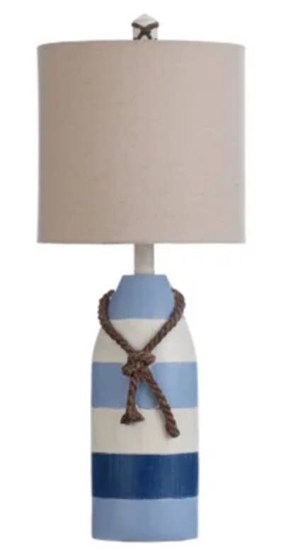 Complete your living room design with this table lamp from Stylecraft. Shown in blue, dark blue and white stripe base and beige shade finish. Make a bold statement by incorporating this stunning table lamp into your home.Read More
